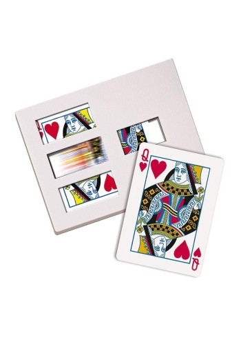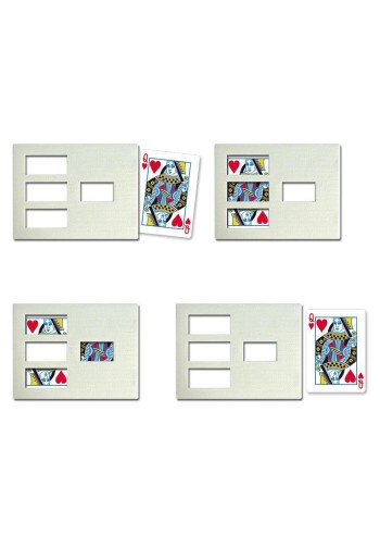 Se inserta una carta seleccionada en un marco. El mago, sin ningún movimiento sospechoso, mueve VISIBLEMENTE la parte central de la carta. Todos verán claramente que la carta está dividida en tres secciones y el efecto es realmente increíble. Para finalizar, el mago empuja la parte central de la carta a su posición original, la retira del marco y muestra la carta completamente restaurada.